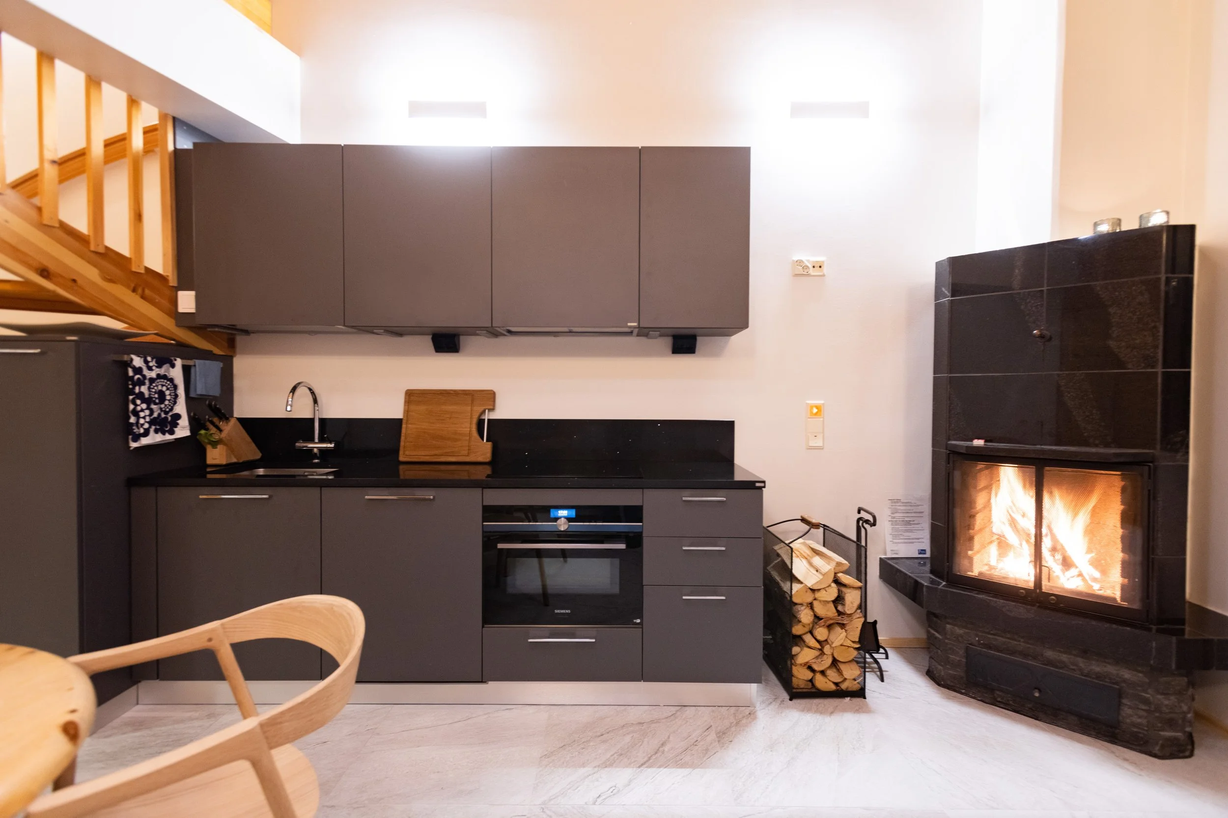The compact living room and kitchen features dining table extendable for six, sofa, sofa chair, fireplace and TV. Music can be played through Genelec sound system.