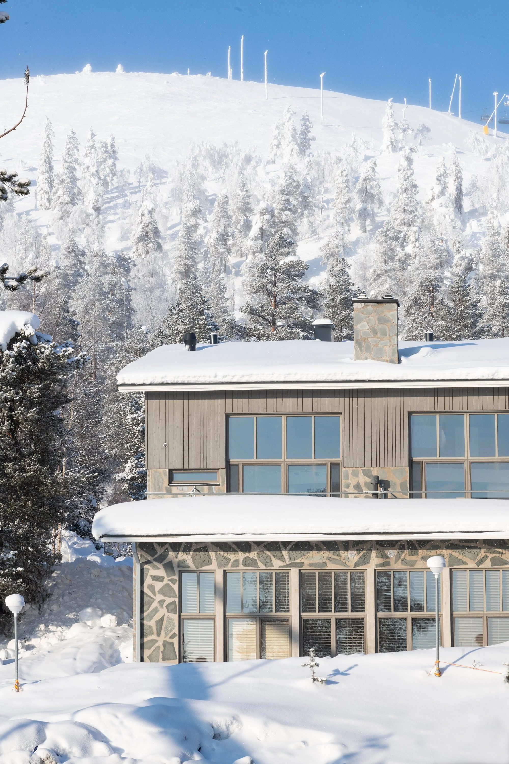 HolySuites 1 is the first apartment in the row with the large living room windows facing south to the horizon and bedroom windows facing the Pyhätunturi fjell.